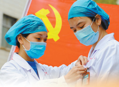 護士黨員戴黨徽宣誓。黃春濤攝(人民視覺)